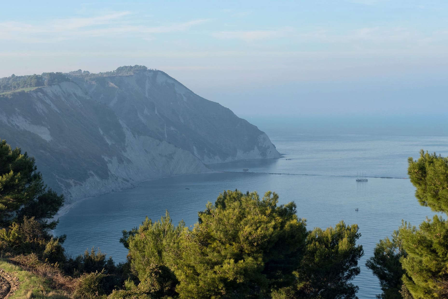 Weiter südlich verändert sich die Küstenlinie dramatisch. Der Monte Conero, ein mit mediterraner Macchia bewachsenes, weißes Felsvorsprung, fällt steil in die Adria ab. Hier findet man keine langen Sandstrände, sondern weiße Kiesbuchten und ein Meer in Türkis- und Smaragdtönen.